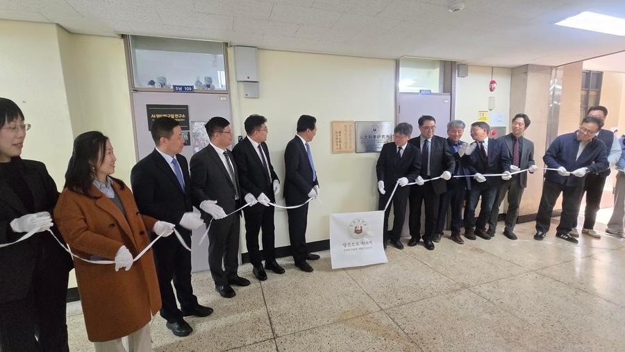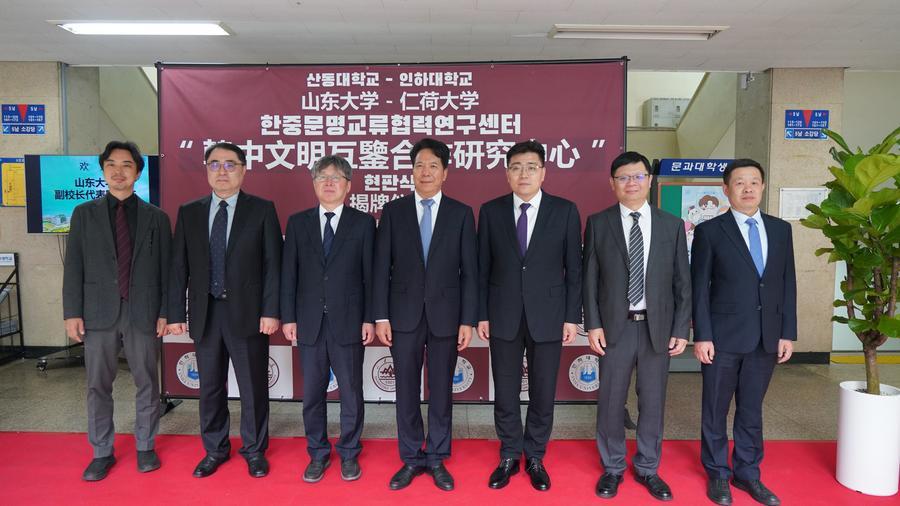 (한국 인천=신화통신) 중국 산둥(山東)대학교 외국어대학과 한국 인하대학교 문과대학이 공동 설립한 중한문명교류협력연구센터 현판식이 31일 인하대학교에서 열렸다.
