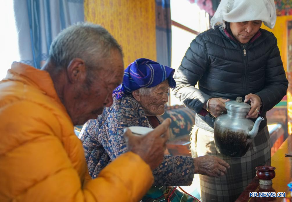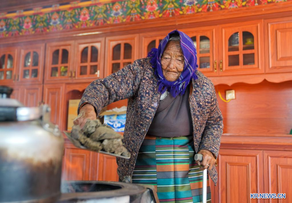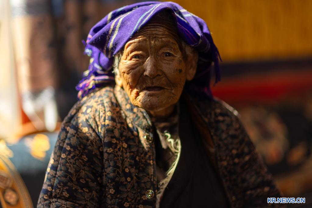[신화망 중국 라싸 3월31일] 올해 95세인 궁줴취전(貢覺曲珍) 할머니는 시짱(西藏)자치구 라싸(拉薩)시 니무(尼木)현에 살고 있다. 고령의 할머니는 약 100년에 가까운 인생의 변화를 이야기하면서 감개무량해 했다.