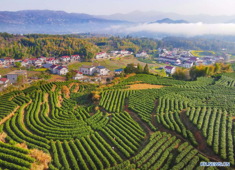 [신화망 베이징 4월5일] 절기상 청명(淸明)을 맞아 봄기운이 완연한 산자락마다 새싹이 돋아나고 각지에서는 명전차(明前茶·청명 전에 따는 찻잎) 수확이 한창이다. 차 재배 농민들은 완만하게 이어진 차밭 능선에서 새싹을 따며 봄의 생기를 담아내고 있다.