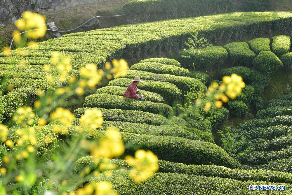 4일 후베이(湖北)성 이창(宜昌)시 쯔구이(秭歸)현의 한 생태 차밭에서 찻잎을 따고 있는 농민.