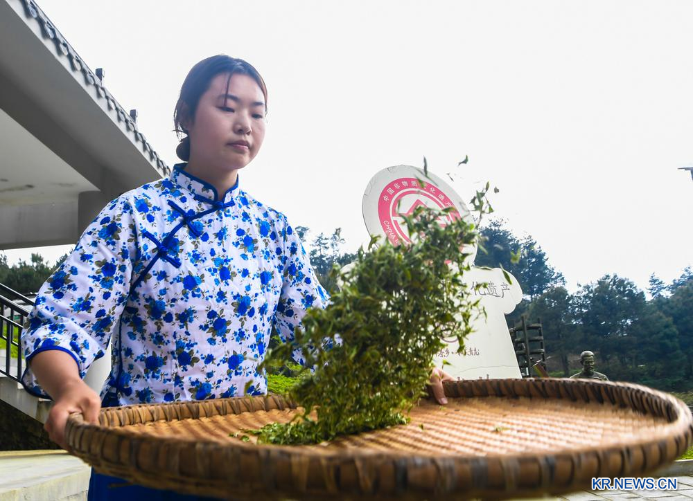 한 농민이 9일 충칭(重慶)시 펑두(豐都)현 칭룽(青龍)향 찻잎 기지에서 차를 가공하고 있다.