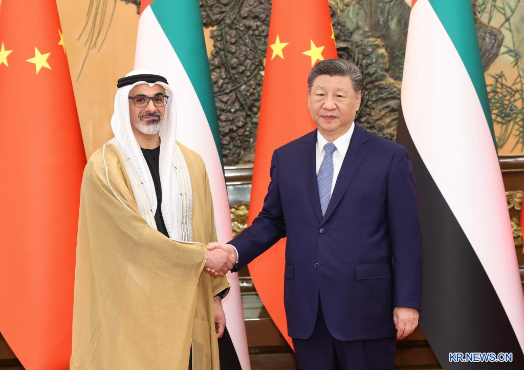 [신화망 베이징 4월14일] 시진핑(習近平) 중국 국가주석이 14일 오전 베이징 인민대회당에서 중국을 방문한 셰이크 칼리드 빈 모하메드 빈 자이드 알 나흐얀 아랍에미리트(UAE) 아부다비 왕세자와 회견했다.[촬영/신화통신 기자 황징원(黄敬文)]