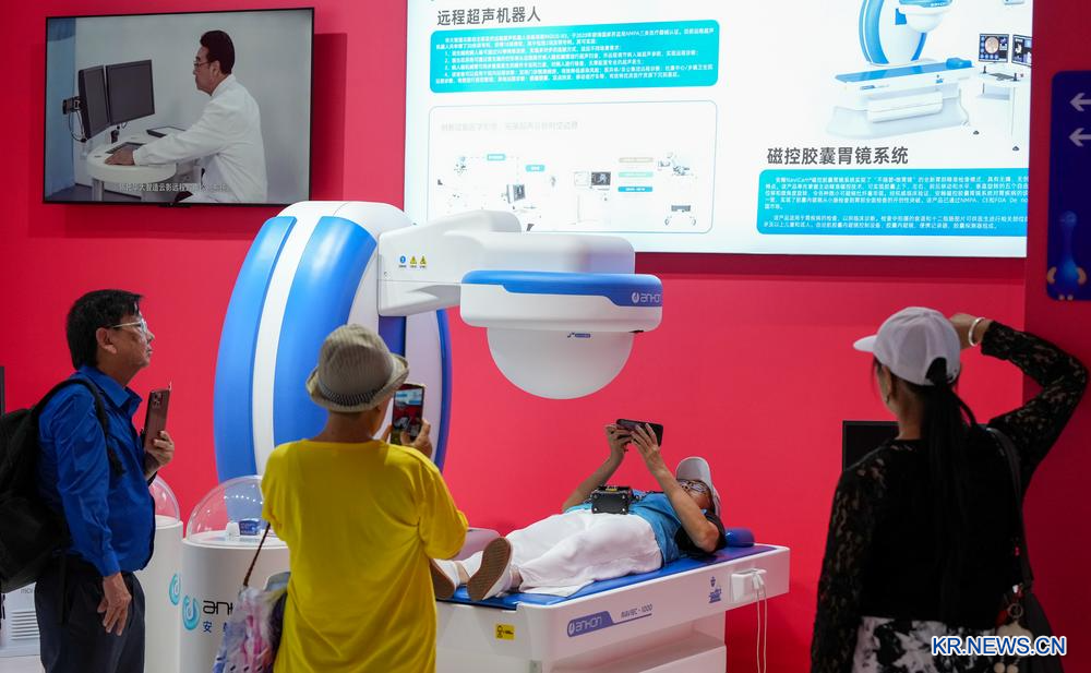 16일 '제6회 CICPE' 국제 건강 소비 전시구역에서 원격 초음파 진단 설비를 체험하는 관람객. 2026.4.16