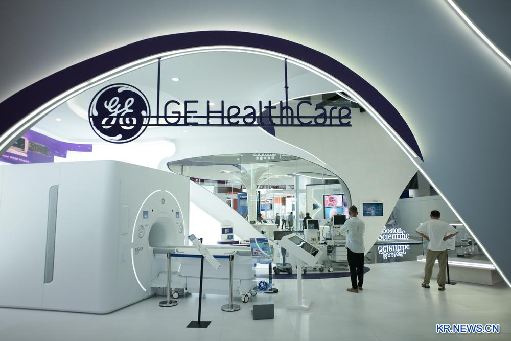 16일 '제6회 중국국제소비재박람회(CICPE)' 국제 건강 소비 전시구역에서 관람객이 제너럴일렉트릭(GE) 헬스케어의 7.0T 자기공명영상촬영(MRI) 설비를 살펴보고 있다