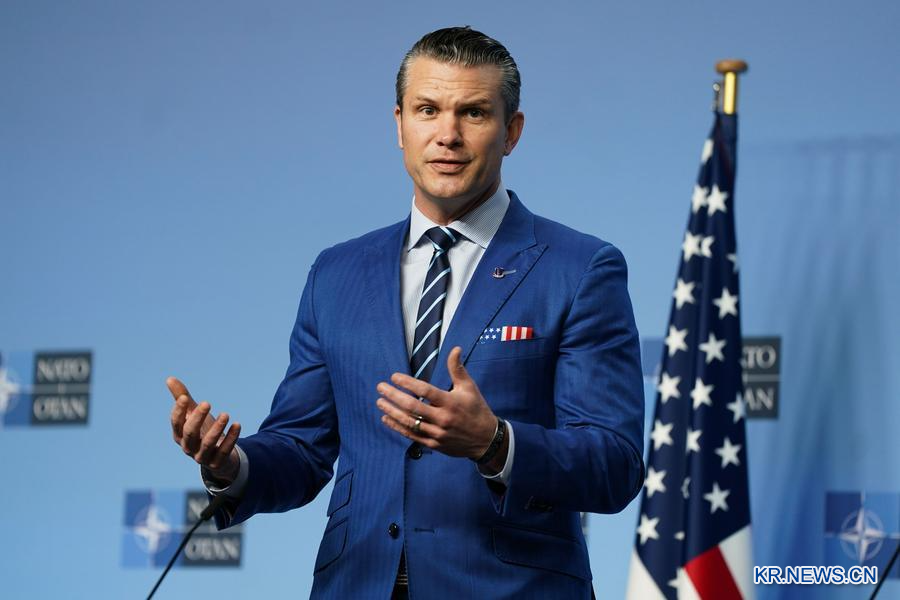 피트 헤그세스 미국 국방장관이 지난해 2월 13일 벨기에 브뤼셀에서 기자회견을 하고 있다.