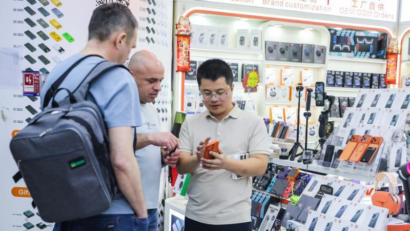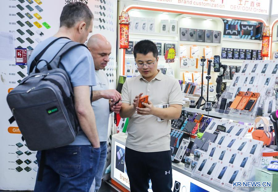 지난달 11일 광둥(廣東)성 선전(深圳)시 화창베이(華強北)의 한 상점에서 직원이 외국인 고객에게 인공지능(AI)기능을 탑재한 상품을 소개하고 있다. (사진/신화통신)