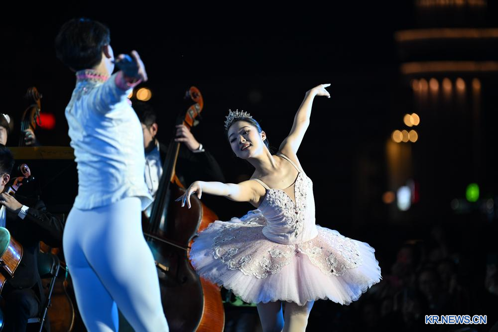 톈진(天津)가무극원 소속 무용수가 18일 저녁 톈진 진완(津灣)광장 친수이(親水)플랫폼에서 발레 공연을 선보이고 있다.