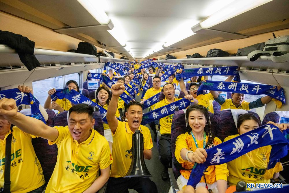축구 팬들이 18일 타이저우(泰州)를 출발해 쉬저우(徐州)동역으로 향하는 C9702편 열차에서 타이저우팀을 응원하고 있다.