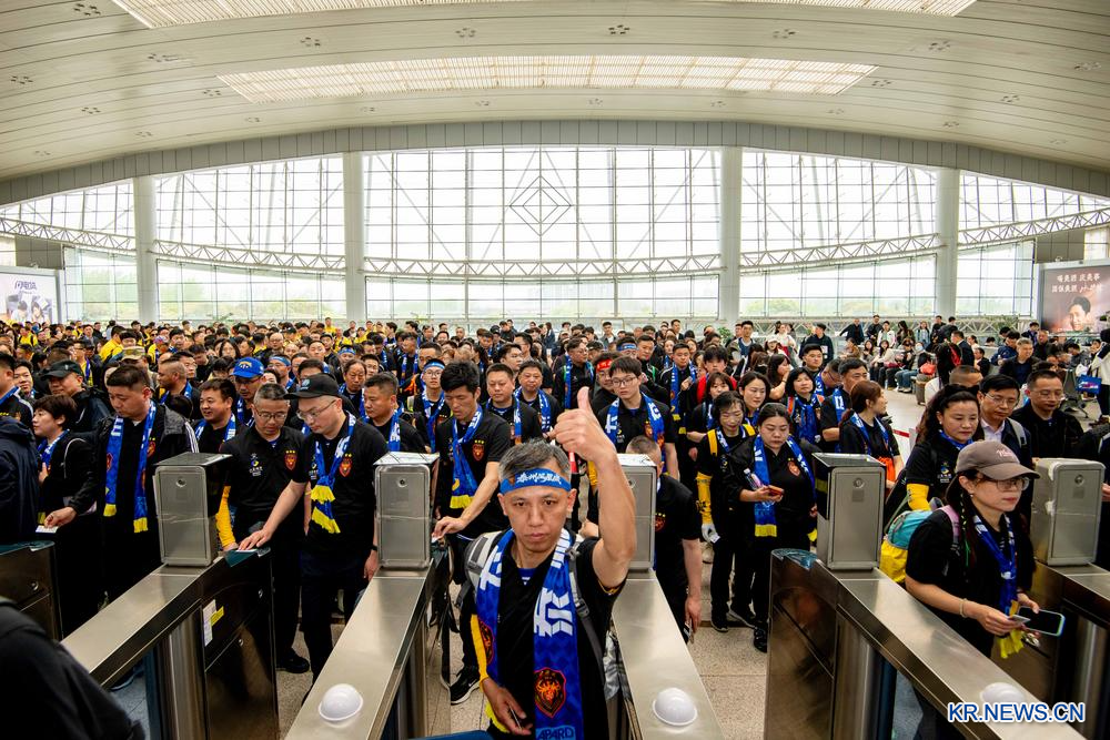 이날 축구 팬들이 장쑤성 타이저우역에서 검표를 마치고 입장하고 있다. 2026.4.18
